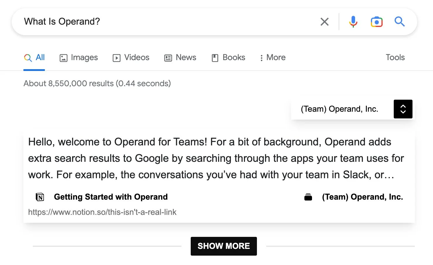 Google search injection: When you searched Google, the extension injected relevant results from your personal Operand index directly into the results page.